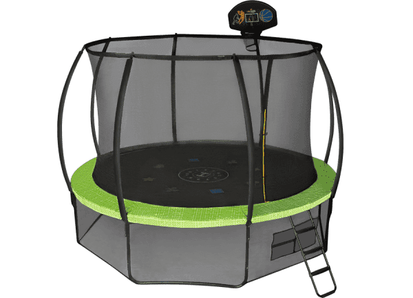• Комплектация:  рамная конструкция, защитный мат двухсторонний, защитная сеть, нижняя защитная сеть, лестница, баскетбольное кольцо, мяч, насос.